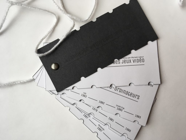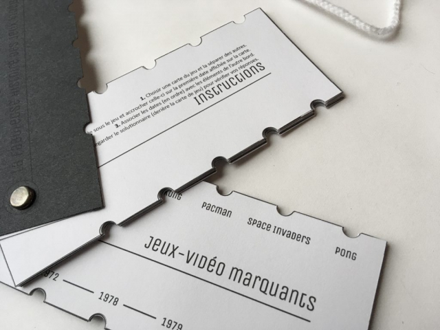 En Conception de jeu vidéo, notre mandat pour ce projet était d’imaginer et de concevoir un objet contenant trois lignes de temps, et ce, ingénieusement. J’ai, pour ma part, réalisé un jeu où nous devons lier les dates d’une carte aux éléments de la ligne de temps. Ces lignes de temps étaient basées sur les informations contenues dans le documentaire La fabuleuse histoire des jeu vidéo.