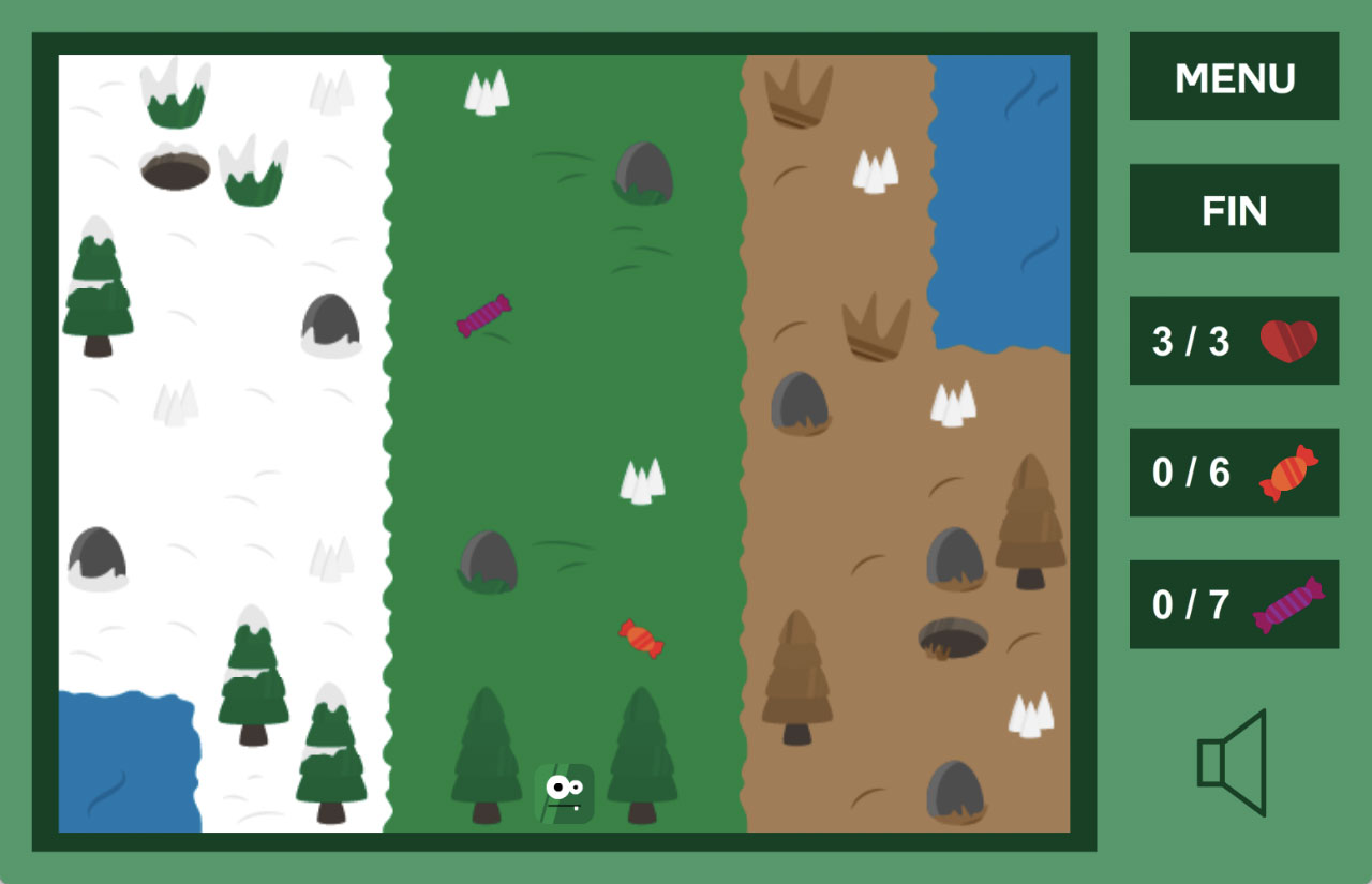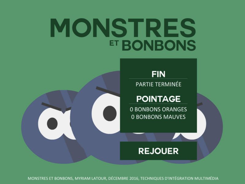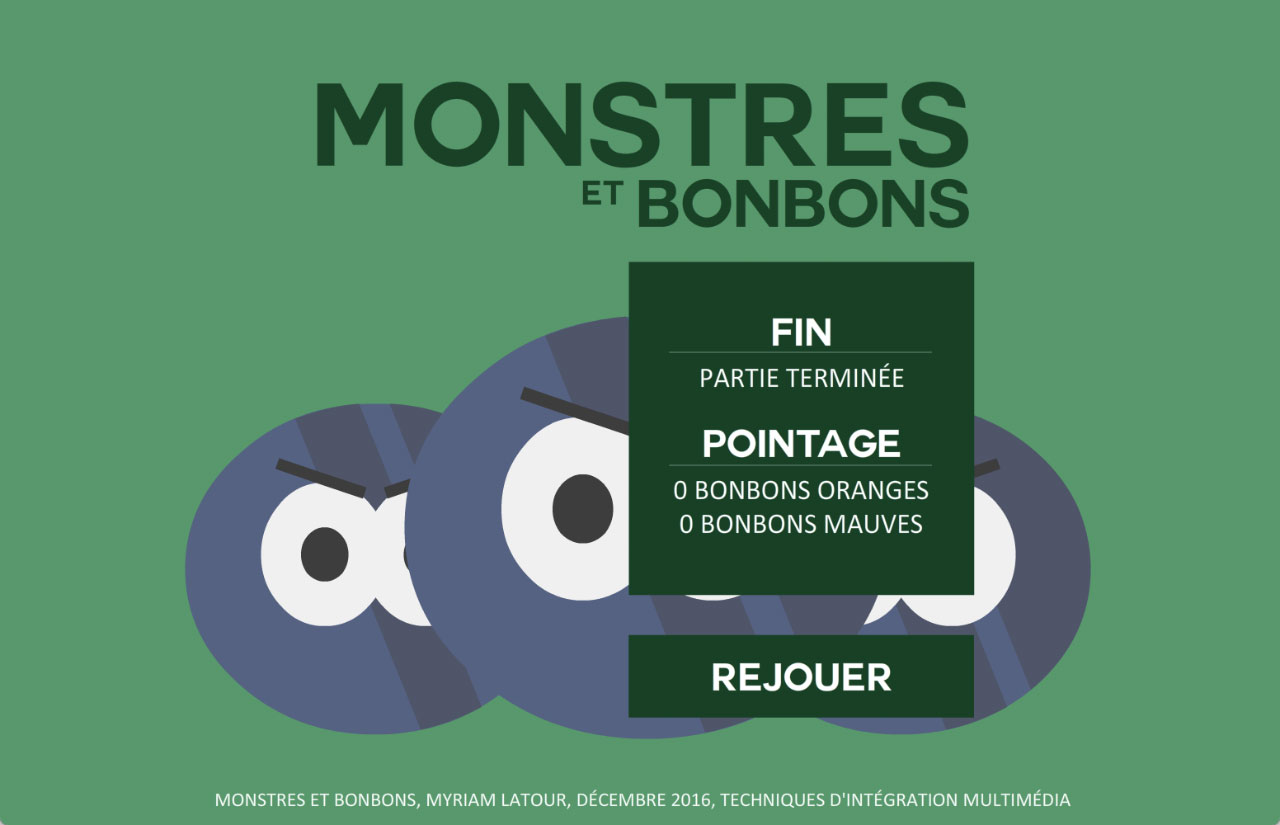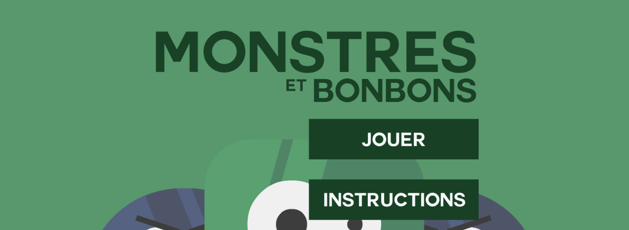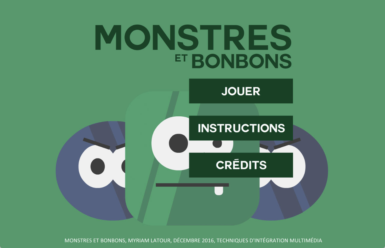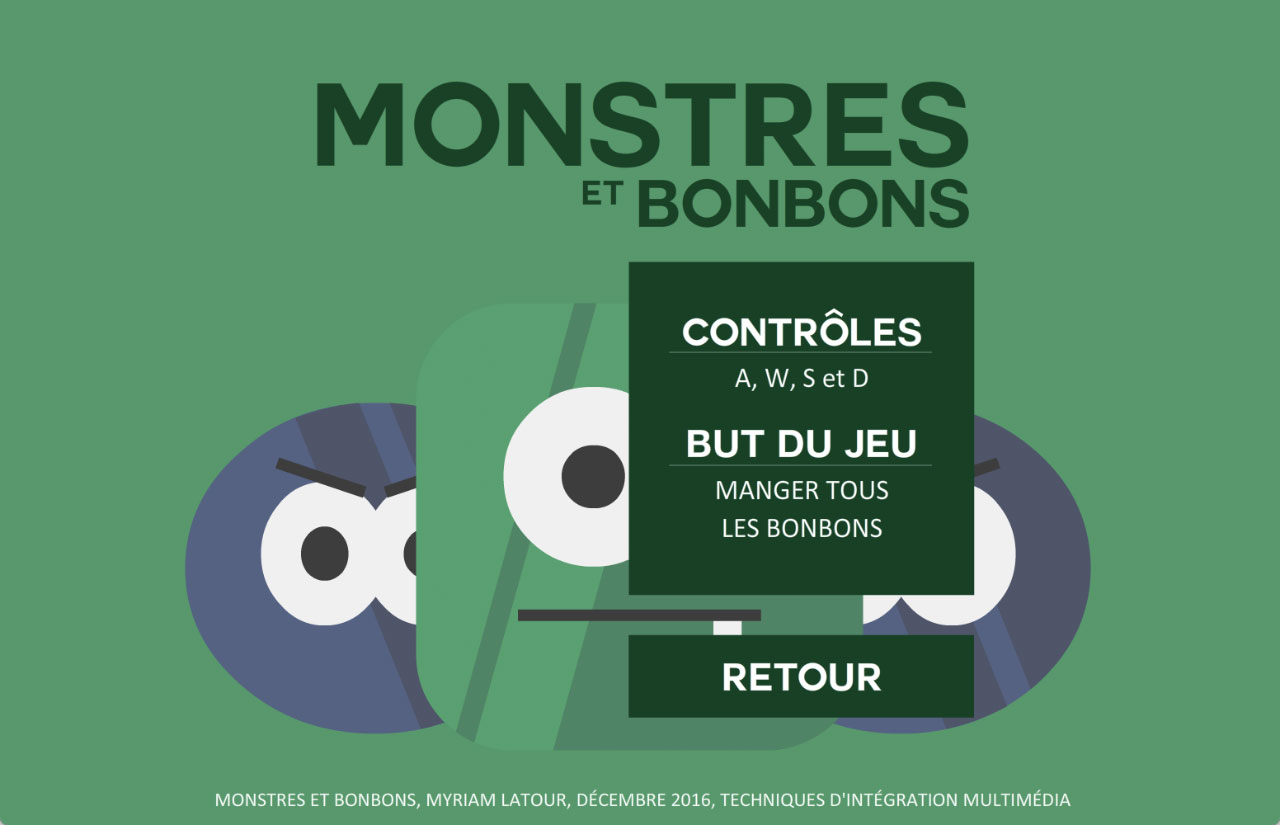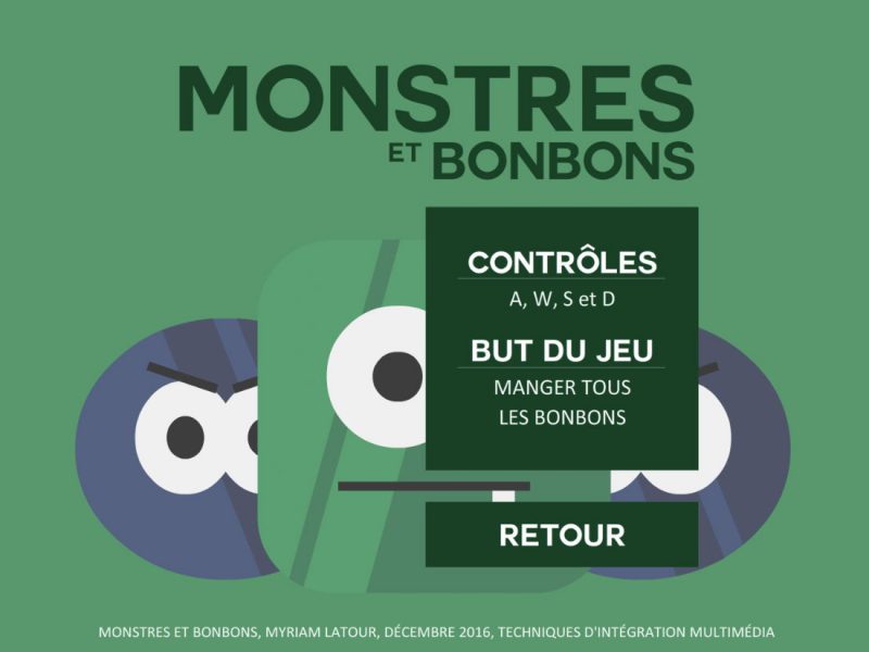 Dans le cadre du cours de programmation multimédia II, notre devis était de réaliser un jeu avec un système de tuiles. Par conséquent, Monstres et bonbons est un jeu où notre héros se déplace, tuile par tuile, pour ramasser tous les bonbons parsemés dans trois maps différentes.